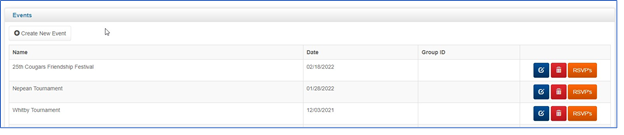- The Events button brings you to the events page. This page allows you to view all team events and create a new event. Like the Practices portion, you can edit, delete or view RSVPs from this page.