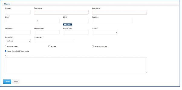 - Selecting the edit button allows you to update any information pertaining to the player as well as check them off as a rookie, affiliated player (AP), or send the RAMP invite.